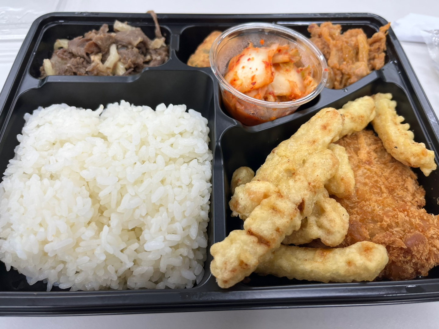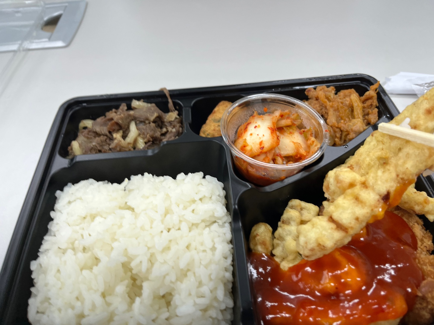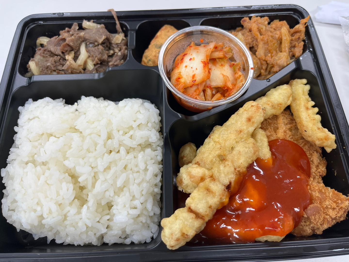 (돈까스와 바삭한 찹쌀탕수육으로 구성된 도련님 도시락에 제육볶음과 소불고기를 더해 푸짐하고 가성비 좋은 도시락입니다.)