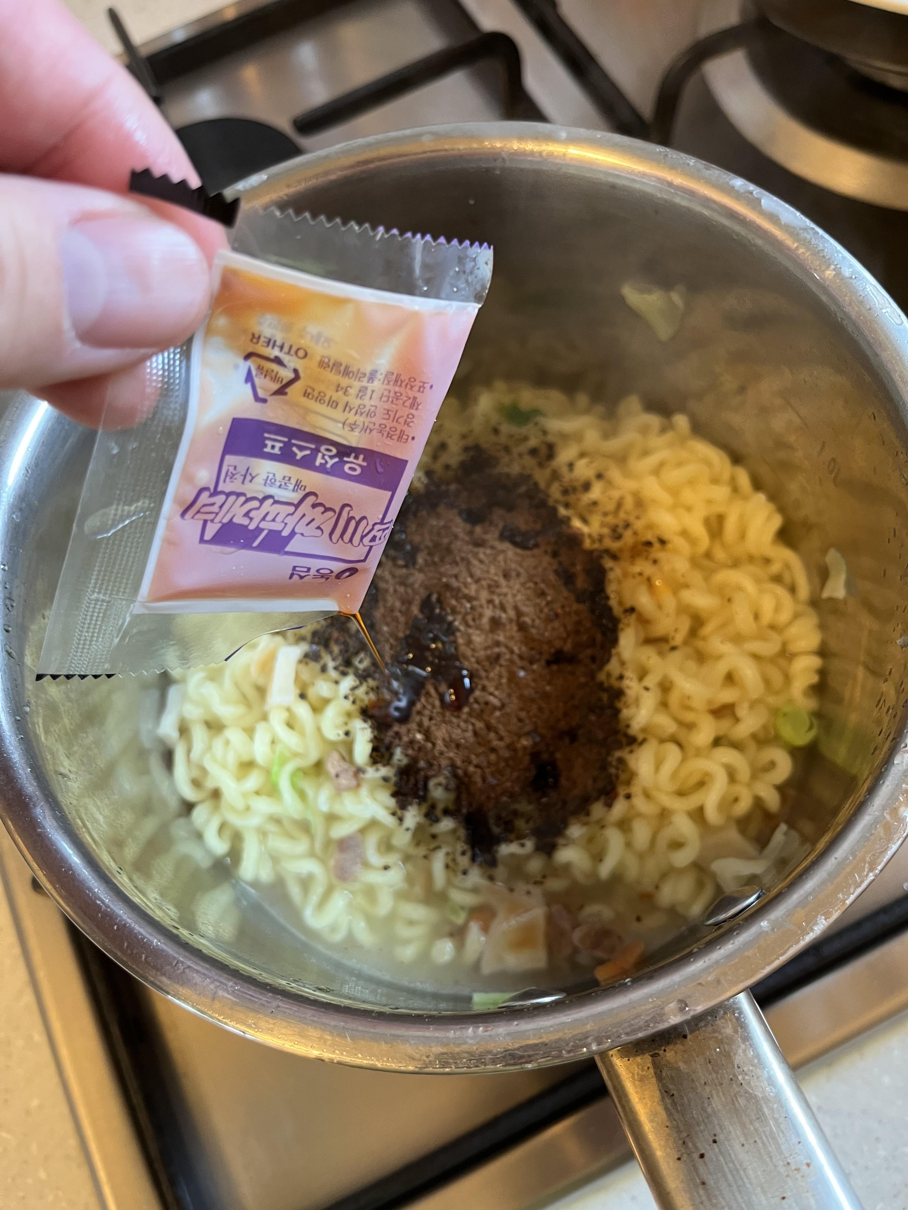 일정량 물을 남겨두고 짜파게티 스프와 유성스프를 넣어줍니다.
